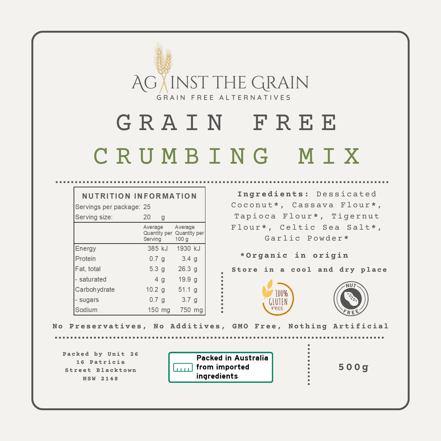 Crumbing Mix: Dessicated Coconut*, Cassava Flour*, Tapioca Flour*, Tigernut Flour*, Celtic Sea Salt*, Garlic Powder*